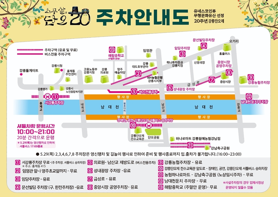 강릉단오제는 매년 수십만 명이 찾는 인기 축제이기 때문에 교통 혼잡이 예상됩니다.